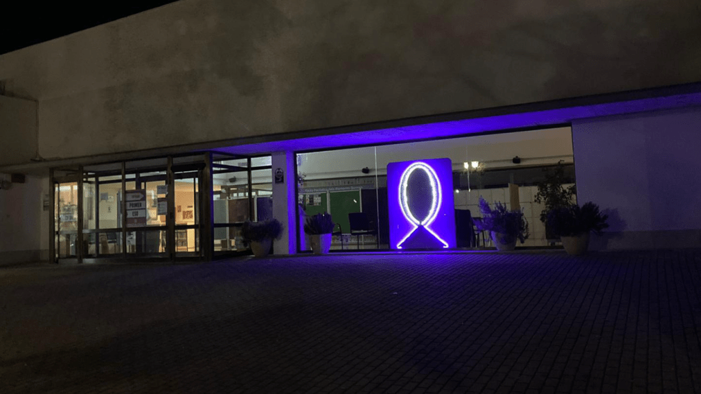 Per aquest motiu, els alumnes d’FP de l’IES Sineu han penjat avui aquest llaç lila que llueix ben lluminós en vestíbul del centre docent.