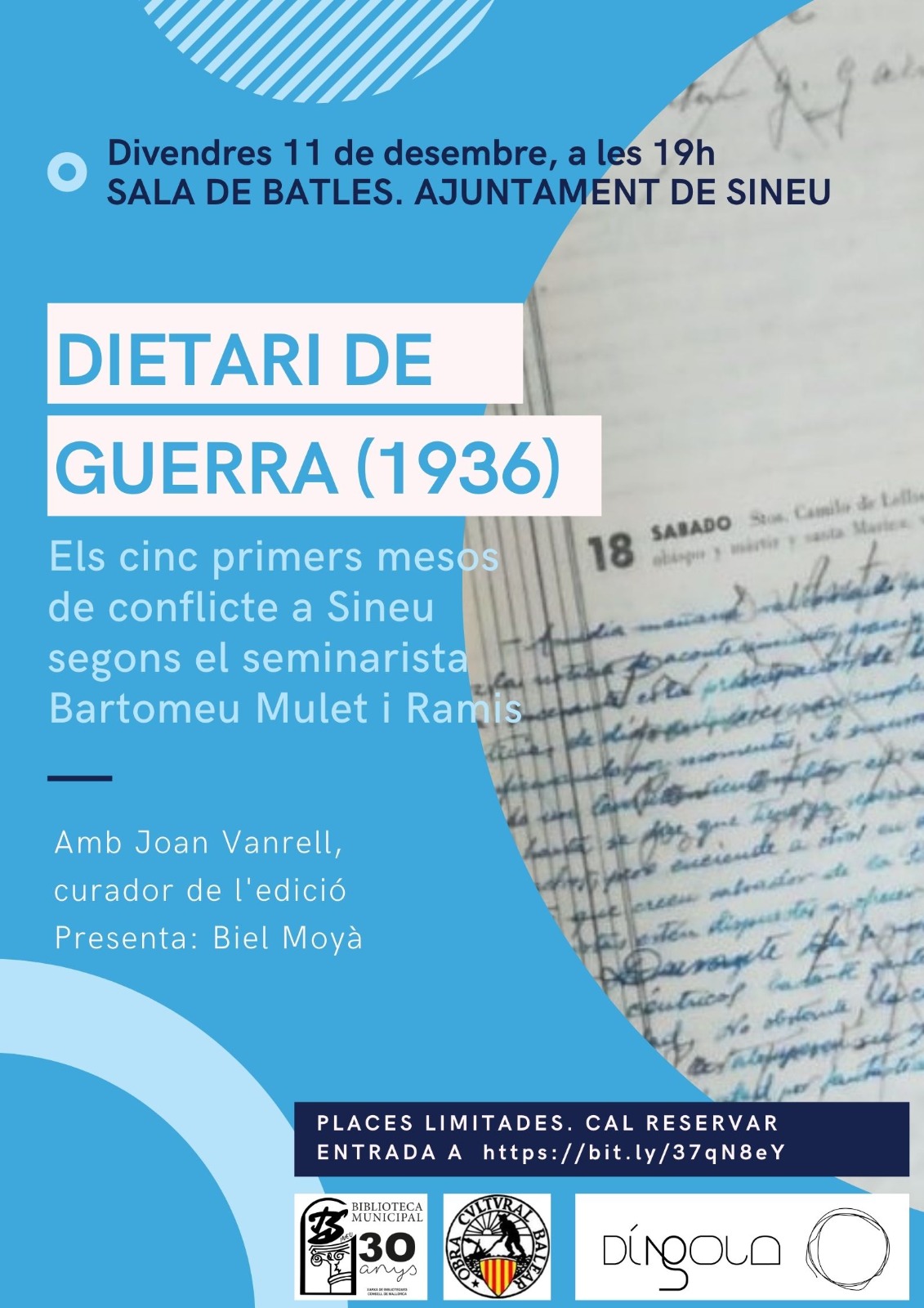 Recordau també que avui a les 19h es presentarà a la Sala de Batles de l’Ajuntament la publicació Dietari de guerra (1936): Els cinc primers mesos del conflicte a Sineu segons el seminarista Bartomeu Mulet i Ramis, organitzada per la Biblioteca Municipal i l’Obra Cultural Balear.