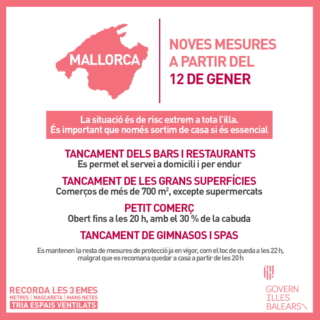 Dimarts dia 12 de gener, una vegada aprovades al Consell de govern de dilluns, entraran en vigor noves mesures restrictives degut a l’increment de contagis de coronavirus a l’illa de Mallorca.