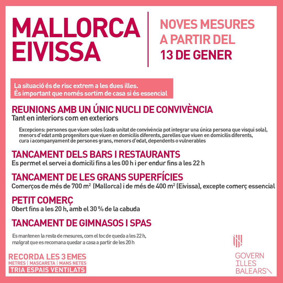 Passades les festes de Nadal i Cap d’Any la situació ha empitjorat ferm, especialment a les illes de Mallorca i d’Eivissa. El Govern ha pres la determinació d’establir noves mesures de contenció del contagi que afectaran de nou, especialment, les relacions socials i locals d’oci com bars, restaurants i gimnasos, a més de les grans superfícies comercials.