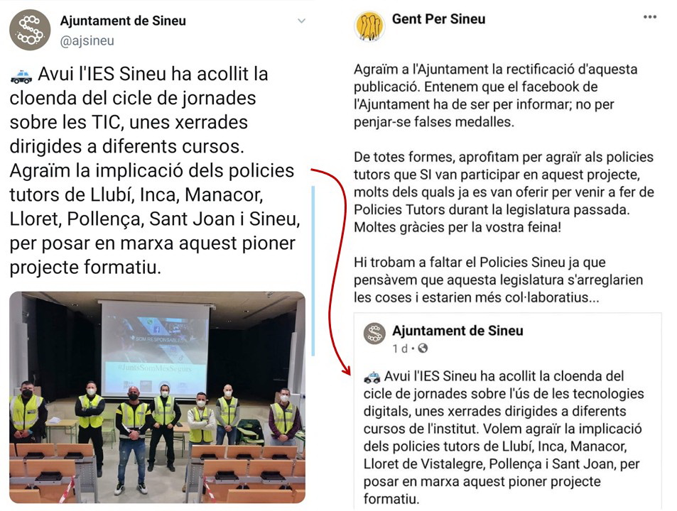 El partit principal de l’oposició, Gent per Sineu (GxS), va compartir el post de l’Ajuntament i va agrair a la institució la rectificació de la publicació inicial. El post de GxS acaba dient «Hi trobam a faltar els policies de Sineu, ja que pensàvem que aquesta legislatura s’arreglarien les coses i estarien més col·laboradors». Fonts del partit sobiranista havien confirmat per algunes vies que la Policia de Sineu no hi havia participat. Díngola ha sabut que el batle i el cap de la Policia de Sineu feren acte de presència a l’acte, però que la Policia no hi participà com a tal.