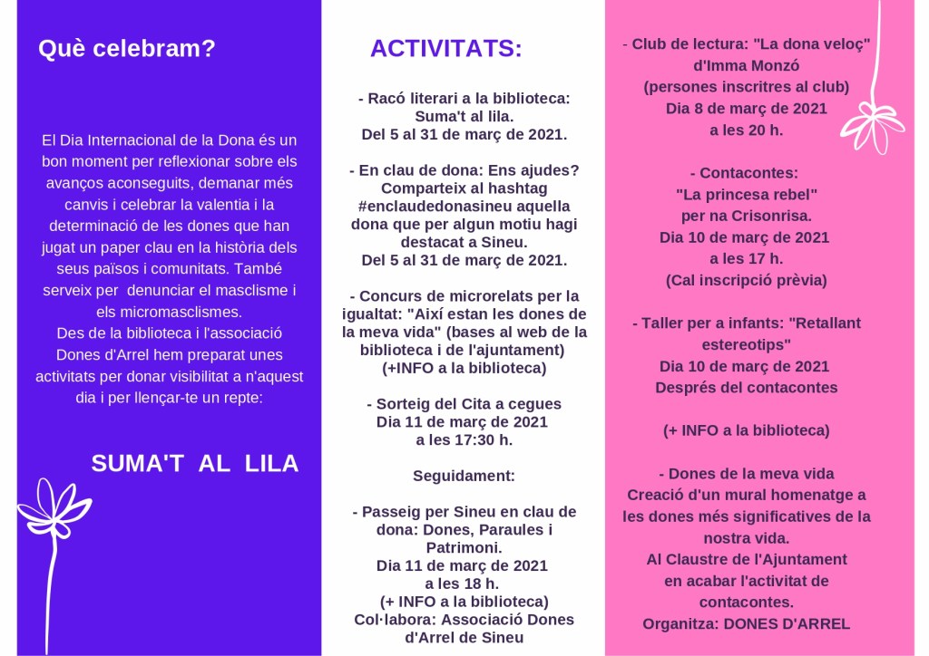 Els actes del Dia de la Dona, dilluns 8 de març, com que la situació sanitària no permetrà aglomeracions, s’han repartit durant diversos dies i en grups reduïts. Ajuntament, Biblioteca Municipal i l’associació Dones d’Arrel en són els organitzadors. Podeu consultar-los en aquest programa (atenció que n’hi ha que requereixen inscripció prèvia):