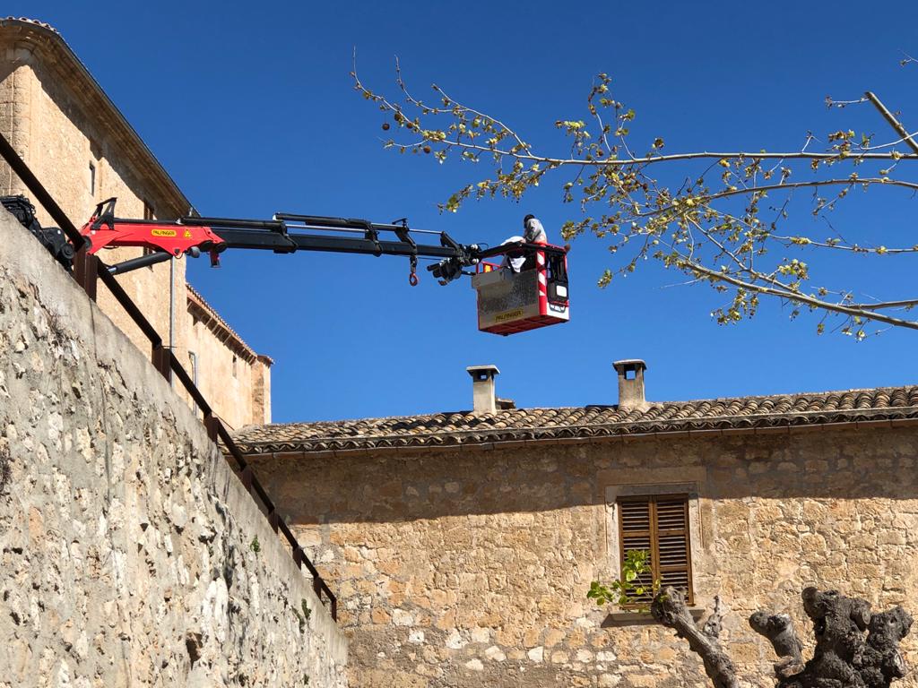 Avui de matí qui hagi passat per la plaça del Mercadal, coneguda també com la placeta de les Dides, haurà alçat el cap en veure la imatge d’una grua amb un braç ben llarg que sostenia una canastra de treball amb dos operaris. Feien feina part damunt les teulades de Son Garriga i Can Dameto, els dos casals que juntament amb les escaletes que s’enfilen cap a la riba configuren una de les estampes més conegudes del nucli urbà. Encara que de cada dia és, per sort, més habitual veure aquest sistema d’elevació per als treballadors del sector de la construcció, la imatge no passava per malla a ningú. Les imatges són preses per la nostra companya Malén Alomar.