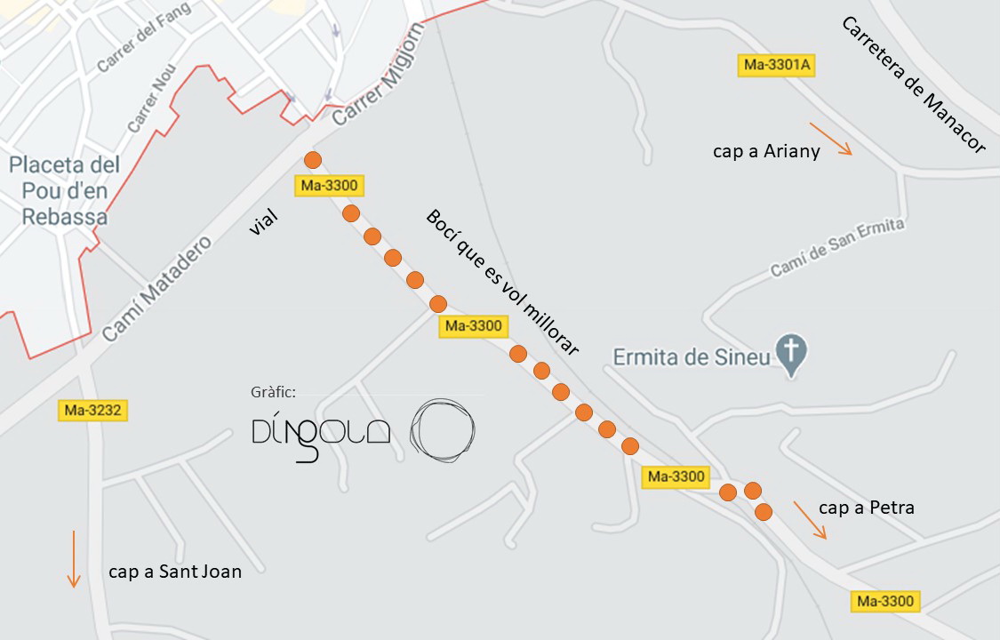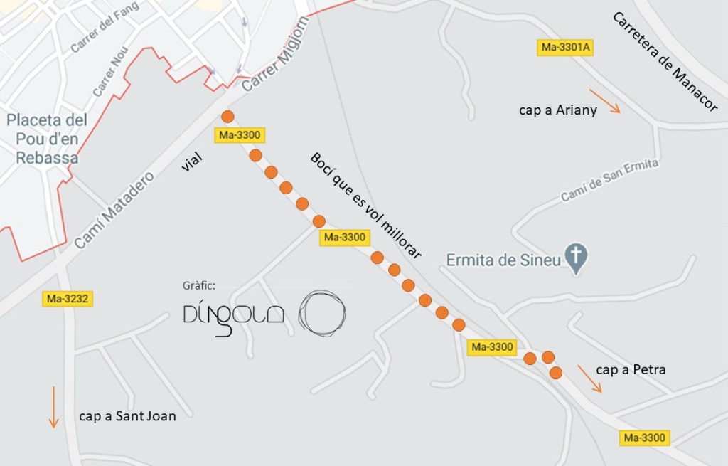 De fet, aquest tram tan estret és el que l’Ajuntament té més pressa per adobar. Així, Mulet ha dit a DíNGOLA que el tram que volen arreglar prioritàriament és el que va des del vial de circumval·lació fins al pont de Son Fiol. En aquest tram dos vehicles de mida mitjana no poden circular simultàniament en direccions oposades: un dels dos s’ha de ficar en un portell i esperar fins que passa l’altre o ha de recular. El problema s’agreuja si es tracta de grans camions.