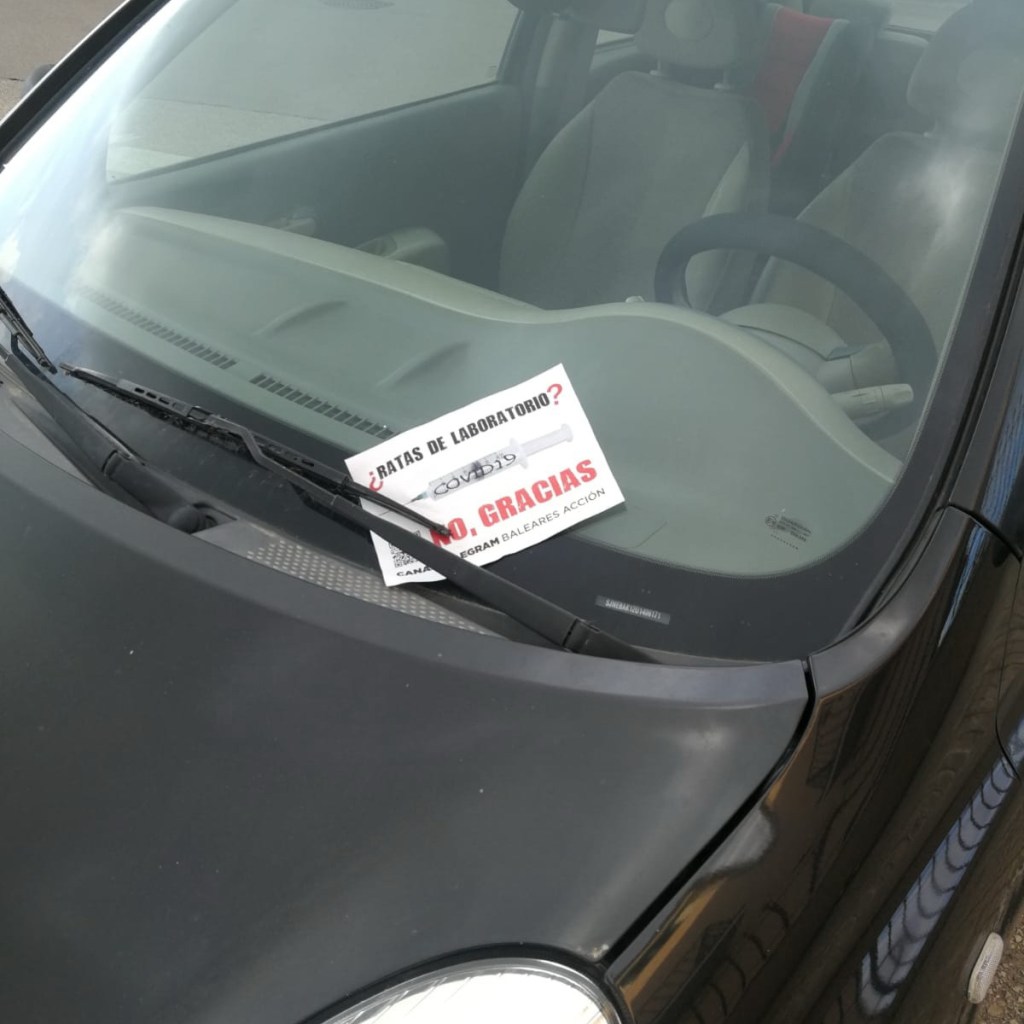 De «surrealista» i «vergonyós» varen qualificar alguns veïnats l’aparició de pamflets de mida Din A5 (la meitat d’un full normal) en el parabrises de molts cotxes estacionats a la barriada de l’estació de tren i es Fossar. Va ser ahir matí que molts veieren que s’havia col·locat –possiblement en horari de toc de queda– propaganda negacionista en el parabrises del seu cotxe. La propaganda negacionista estava només en castellà i es demanava “Ratas de Laboratorio?” i s’autocontestava “No, gracias”, i estava il·lustrada per una vacuna de covid19.