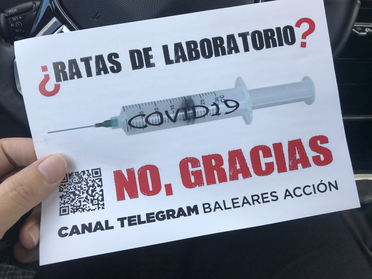 Els pamflets, amb faltes d’ortografia i inexactitud en el seu contingut –per exemple detallant tot un llistat de possibles efectes secundaris de la vacuna que, fent una senzilla recerca a Google, es pot comprovar que són també possibles efectes secundaris de dotzenes de medicaments que prenem habitualment–, demanaven adherir-se a un canal de missatgeria instantània a través de Telegram, Baleares Acción. Aquest és un grup que pregona tot el contrari de la ciència i la medicina, i diu –en la mateixa línia del cantant Miguel Bosé– que les proves PCR, les vacunes, les mascaretes, etc. són tot un muntatge orquestrat pels governs, i que «ens tenen dins un estat totalitari».