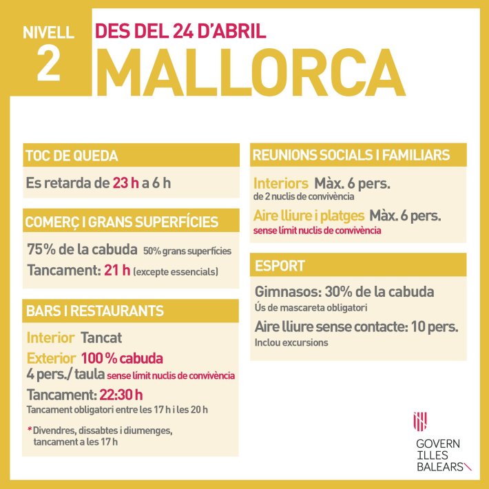 Avui, el Govern balear ha anunciat noves mesures de flexibilització que entraran en vigor aquest dissabte i seran vigents fins dia 9 de maig, una vegada que ho acordi el Consell de Govern que es celebrarà demà, en sessió extraordinària.