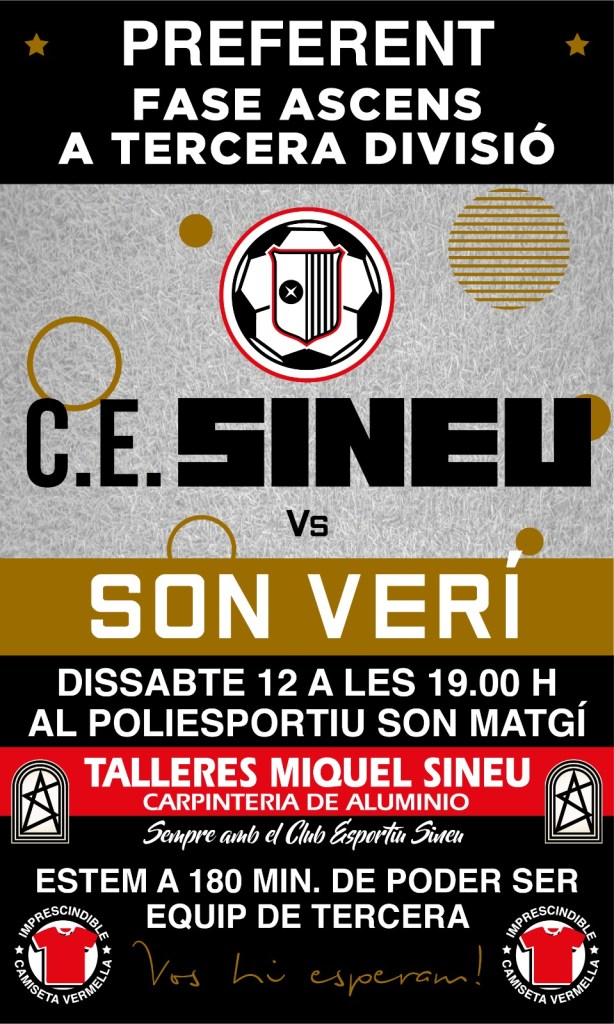 Dissabte es disputa el partit d’anada al Camp de Son Matgí de Sineu a les 19,00 h i l’altre cap de setmana el C.E. Sineu visitarà el camp del Son Verí A. L’equip que tregui millor resultat d’ambdós partits pujarà a la Tercera Divisió balear.