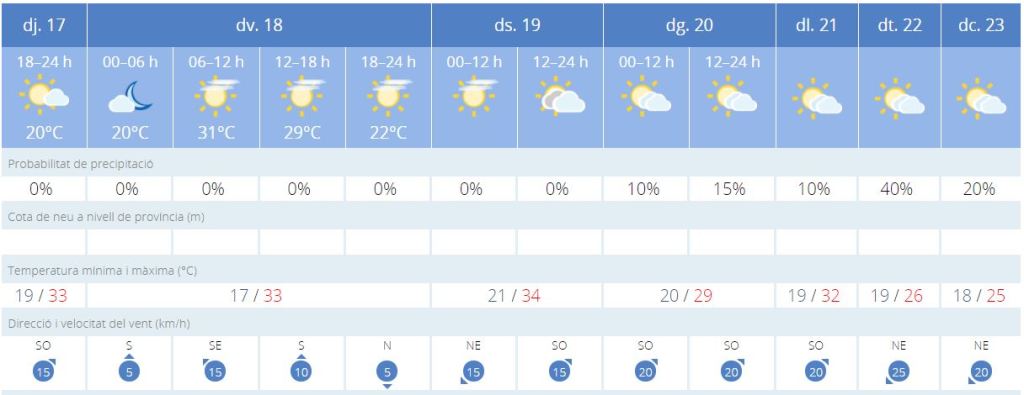 A partir de dimarts podrien començar a descendir un poc les temperatures màximes. Les temperatures al voltant dels 35 ºC gairebé fan d’aquest final de primavera un avançament de l’agost. Aquest dissabte tornarà fer dia de platja, amb màximes que poden arribar als 34 ºC. Diumenge baixaran uns 5 ºC (farà calor, molta calor, però no tanta), per tornar pujar un poc el dilluns. Però és a partir de dimarts i dimecres que baixaran uns 5 ºC més, situant-se en uns nivells més normals pel temps que estem.