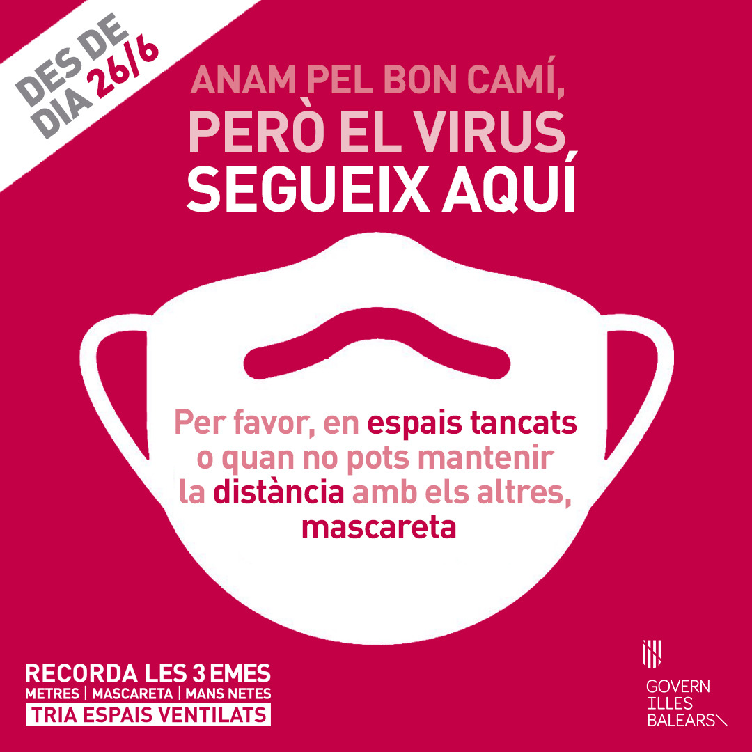 “A partir de demà, ja no serà obligatori dur la mascareta a l’exterior. Però no hem de baixar la guàrdia: el virus continua aquí. En espais tancats o quan no puguis mantenir la distància, protegeix-te, protegeix els altres”. Aquest és el missatge del govern balear per a permetre no fer ús de la màscara en espais oberts.