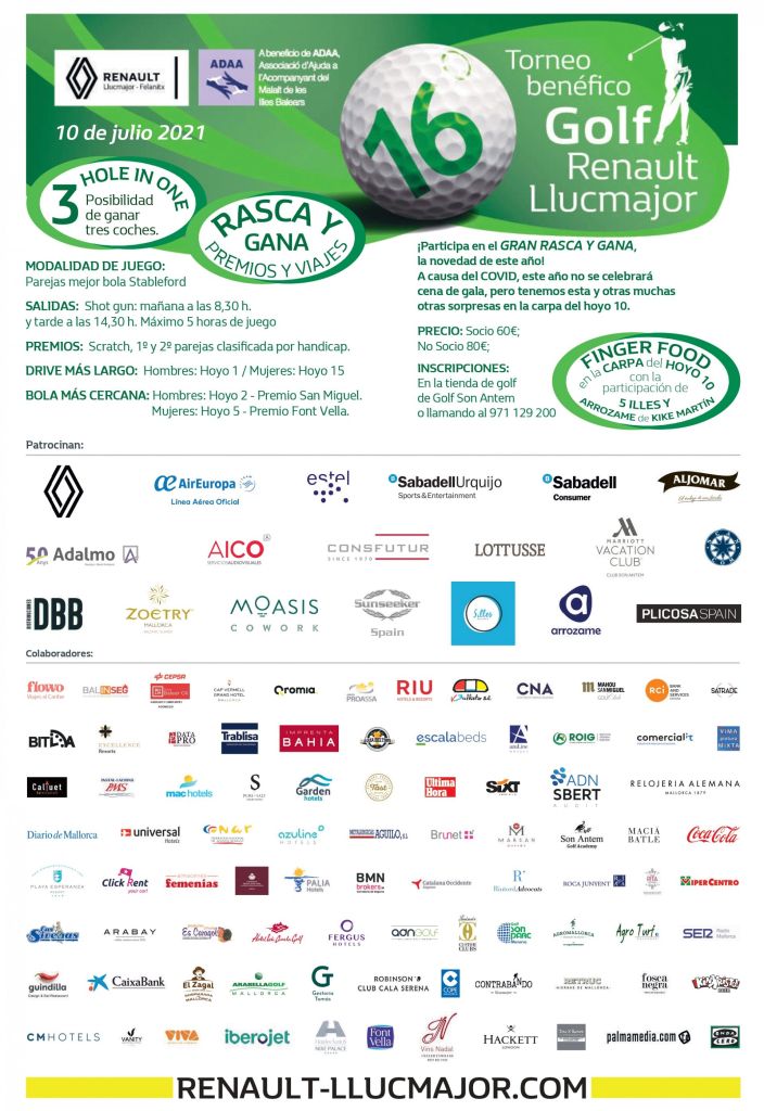 La parella sineuera formada per Tolo Florit i Joan Gabriel Ferriol varen guanyar la 16a edició del Torneig benèfic Renault Llucmajor de golf, disputat al camp de golf Son Antem aquest passat dissabte. La beneficència és a favor d’ADAA (Associació d’Ajuda a l’Acompanyant del Malalt de les Illes Balears).