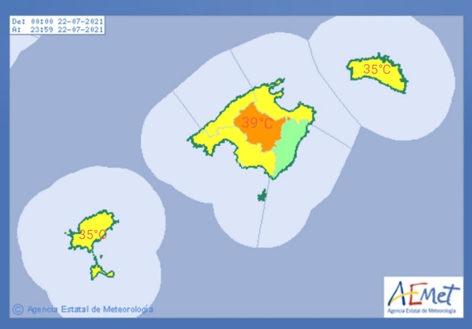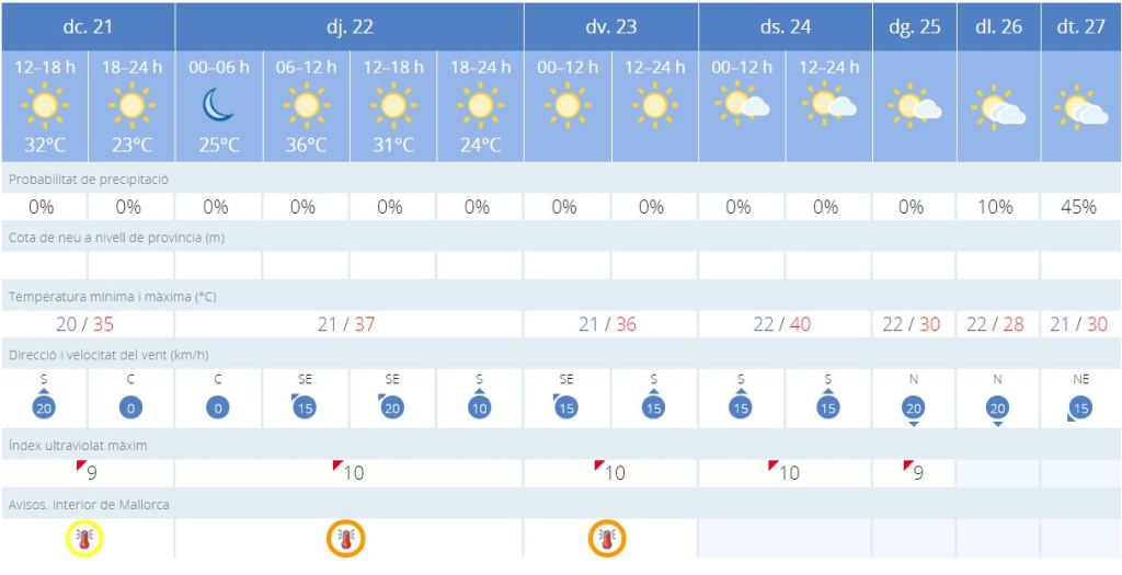 L’AEMET ha emès avís meteorològic per altes temperatures, els dies que venen. Així, les màximes per dissabte poden fregar els 40 ºC. Si avui dimecres a Sineu estàvem en alerta groga, per demà dijous i per divendres el risc puja a taronja.