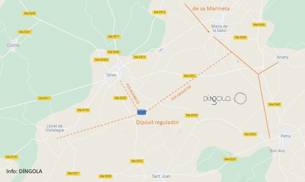 Ara l’Ajuntament de Sineu haurà de cercar un lloc per construir aquest dipòsit. Mulet ha explicat a DíNGOLA que la idea és que l’aigua arribi de Maria de la Salut per gravetat, i per tant el lloc ideal per construir la infraestructura serà un punt entre la carretera d’Ariany i la carretera vella de Petra, pel Camí de Santa Margalida, més o menys per on està situada la benzinera de Shell. Des d’aquest dipòsit l’aigua es distribuirà per bombeig cap a on faci falta.