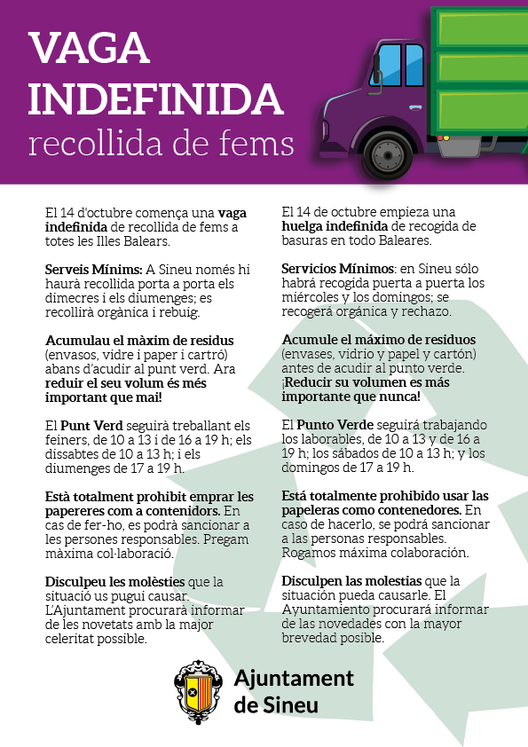 L’Ajuntament ha editat un full informatiu sobre l’afectació d’aquesta vaga al servei de recollida del poble, per saber com es concreten els serveis mínims decretats: