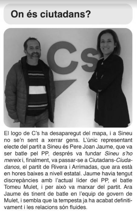 DíNGOLA, sempre atent a l’actualitat municipal, es demanava que passava amb C’s. I de fet, a la nova revista en paper que surt demà, us trobareu un xafardeig que està des actualitzat. Perquè quan es va donar la noticia de l’esqueix del carnet de C’s per part de Jaume, la revista ja estava enfornada. Aquesta és la noticia que surt a la nova DíNGOLA: