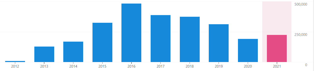 El gràfic mostra que, a unes hores d’acabar l’any 2021, hem recuperat la tendència ascendent quant a nombre de visitants, després de quatre anys en lleugera disminució.
