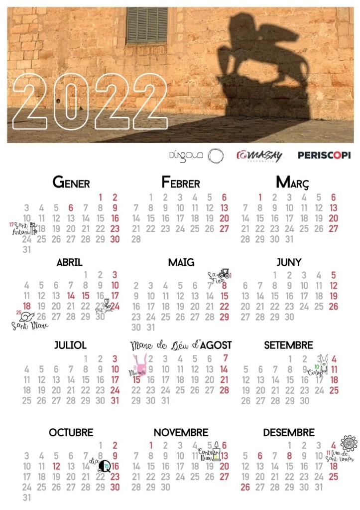 Falten només unes hores per començar un nou any. Un any que desitjam que no sigui com aquests dos anteriors. PERISCOPI ESTUDI –on imprimim la revista en paper–, el nostre col·laborador Macià Puiggròs –MASSAY FOTOGRAFIA– i l’OBRA CULTURAL BALEAR de Sineu –editora de Díngola– han tengut un petit detall amb els socis i subscriptors. Si sou socis de l’OCB o subscriptors anuals de Díngola en paper, haureu rebut un calendari “molt sineuer” amb la darrera revista. És un calendari en clau local, que inclou les festes més sineueres i recalca les dates més rellevants del nostre calendari: Sant Marc, sa Fira, la Mucada, el festival de teatre visual Ciclop, el Dia Q, Contrallum, la fira de Sant Tomàs…