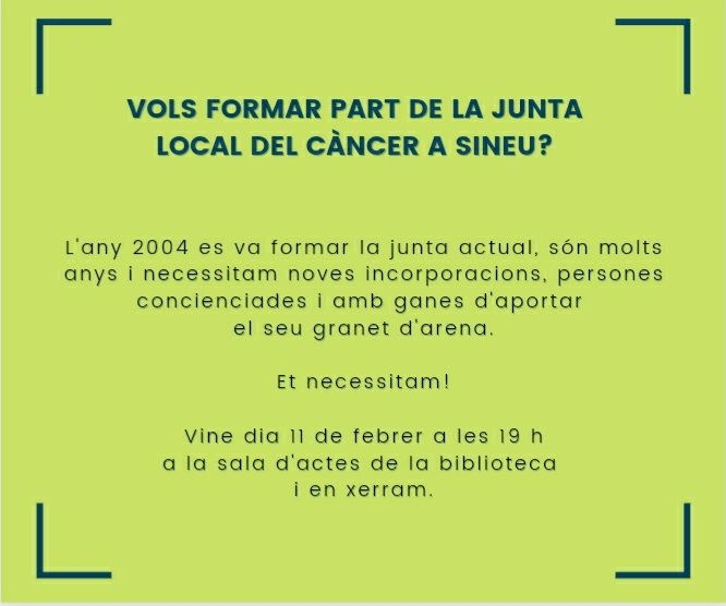 La junta directiva local de l’Associació Espanyola Contra el Càncer (AECC) ha fet saber que cerquen persones per a renovar els càrrecs que ocupen des de l’any 2004. Amb un missatge clar i directe “són molts anys i necessitam noves incorporacions”, fan una crida a “persones conscienciades i amb ganes d’aportar el seu granet d’arena”; així, convoquen els interessats a una trobada el proper 11 de febrer, divendres, a les 19 h a la sala d’actes de la Biblioteca Municipal.