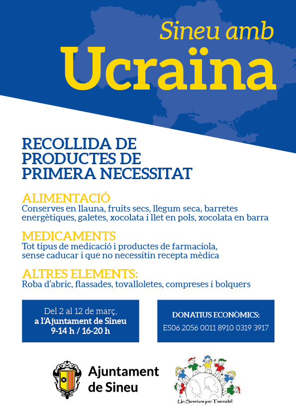 Per altra banda, l’Ajuntament de Sineu amb l’associació ‘Un Somriure per Txernòbil’ han iniciat la recollida de productes de primera necessitat (medicaments, roba d’abric, aliments…) per Ucraïna. Podeu col·laborar-hi portant el vostre material a l’Ajuntament, a partir de demà, del 2 al 12 de març.