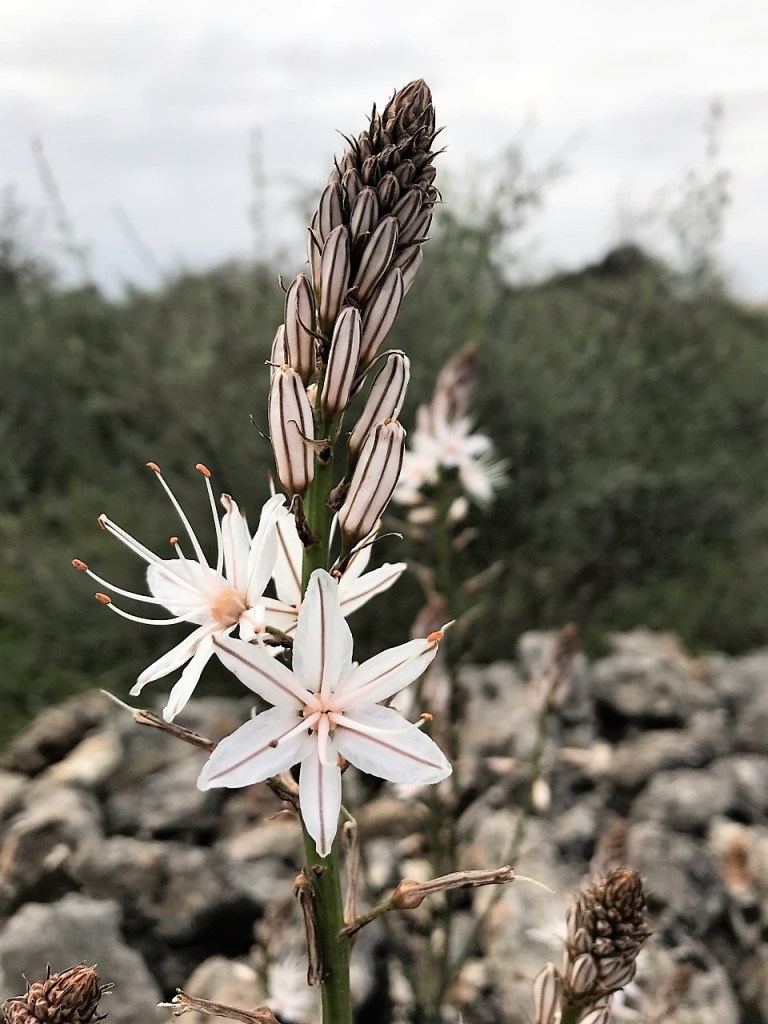 Les plantes més omnipresents ara en els nostres camins són les asfodelàcies, arxiconegudes. Una és l’albó (Asphodelus ramosus) –anomenada porrassa quan no té l’espiga floral que surt d’enmig del rosetó de fulles– i el cebollí (Asphodelus fistulosus). De totes dues us en parla degudament el nostre col·laborador, el Dr. Gabriel Moyà Niell, en aquest article (fes clic) de fa poc més d’un any a la DíNGOLA digital. Són una veritable plaga a les voreres de camins, i de fet, en el seu article, Moyà diu que «ocupen, o millor dit envaeixen» les terres no conreades o molt pasturades, i les garrigues. L’albó és una planta habitualment poc estimada, i això és una injustícia –en la mateixa línia en la que es referia Bonner sobre les margalides (vegeu més amunt)–. La flor de l’albó, vista de prop, és preciosa, com es pot copsar en una de les fotos d’aquest article.