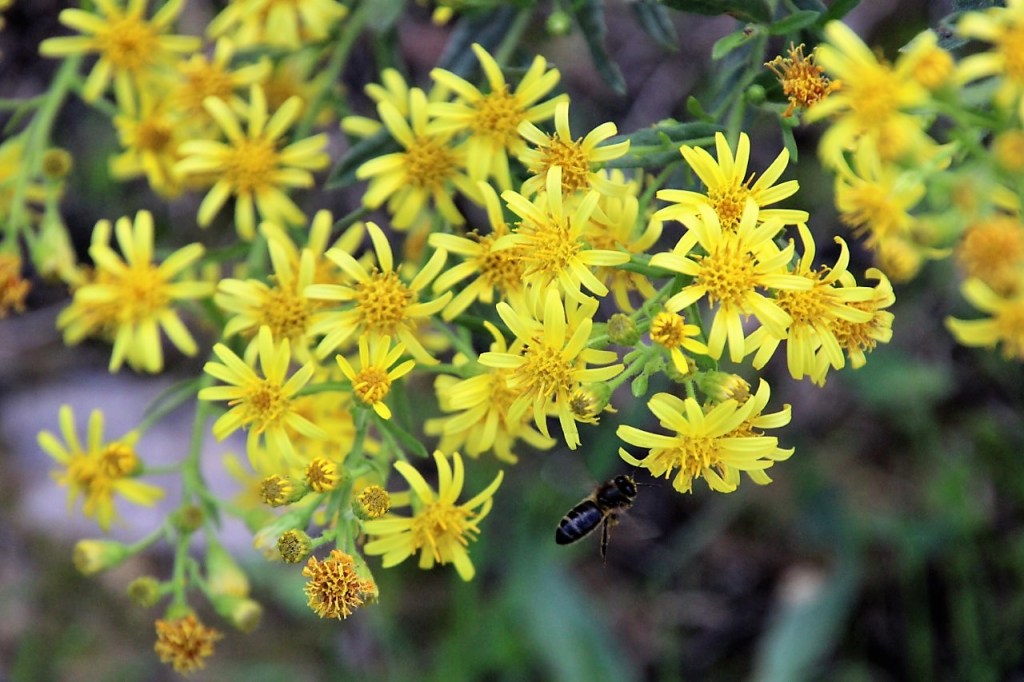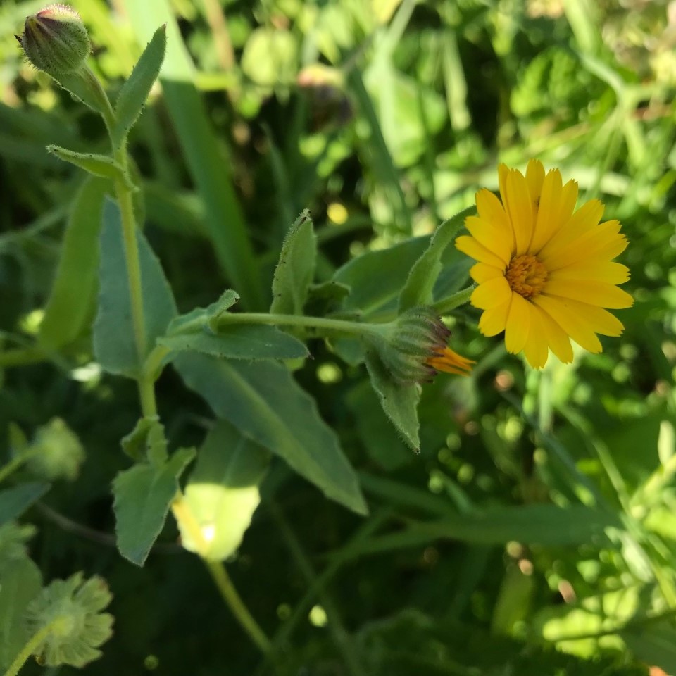 Casualment, a la primavera d’hivern, la tardor, una altra planta de flors grogues també omple els nostres camps no cultivats i les voreres de camins i carreteres, l’olivarda (Dittrichia viscosa), com explicàrem en aquest post (fes clic). I a l’hivern, també una flor de colors groguencs més tirant a ataronjats, el llevamans (Calendula arvenses) també omple les finques mal cuidades o les voreres de les vies [arvense = que creix dins els sembrats]. D’olivarda ara no n’hi ha –bé, més ben dit, no està florida, perquè les seves tiges llenyoses queden perennement en el mateix lloc, i es van assecant o podrint amb el pas dels mesos–. Tant l’olivarda com el llevamans són asteràcies (o compostes), família que compta amb nombrosos representants ara a primavera, i que són una font importantíssima de pol·len i nèctar, aliment per a infinitat d’insectes necessaris pel manteniment de l’equilibri ecològic.