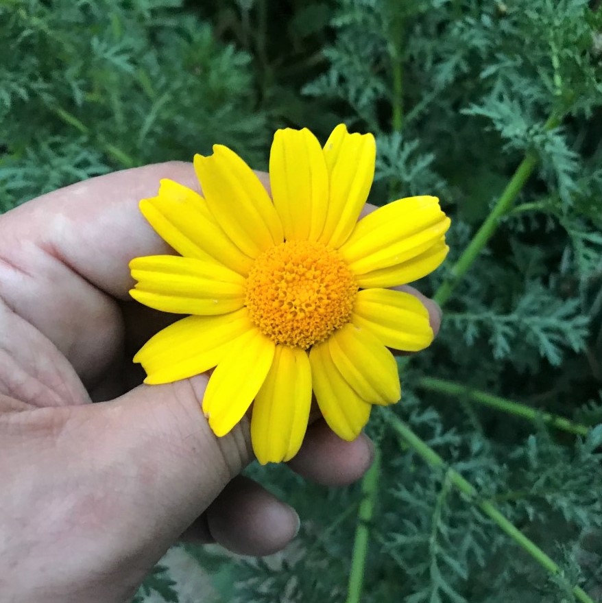Una planta que també té flors grogues és l’asteràcia que rep els noms de bolitx o moixos, però que a Sineu solem conèixer amb el nom de margalida (Glebionis coronarium). És una planta robusta , amb inflorescències de dos tipus: tota groga, o amb les llengües laterals que són meitat grogues i meitat blanques. Antoni Bonner, en el seu llibre ‘Plantes de les Balears’ diu que és una planta «bellíssima, que seria molt apreciada si no fos tan abundant, sobretot en llocs tan poc exòtics com solars per edificar[…]». És la típica planta que d’al·lots agafàvem per saber si la persona de la que estàvem enamorats també ens estimava: aleshores anàvem arrencant les llengües laterals de la inflorescència i anàvem dient «m’estima, no m’estima, m’estima, no m’estima…», successivament, cada vegada que arrencàvem una llengua. La darrera que arrencàvem corresponia a «m’estima» o a «no m’estima», i així sabíem si el o la que ens agradava també estava enamorat o enamorada de nosaltres. Cal dir que “les flors” de margalida no són flors, sinó inflorescències, és a dir, agrupacions de centenars de floretes més petites, tubulars les centrals, i amb llengua les laterals.