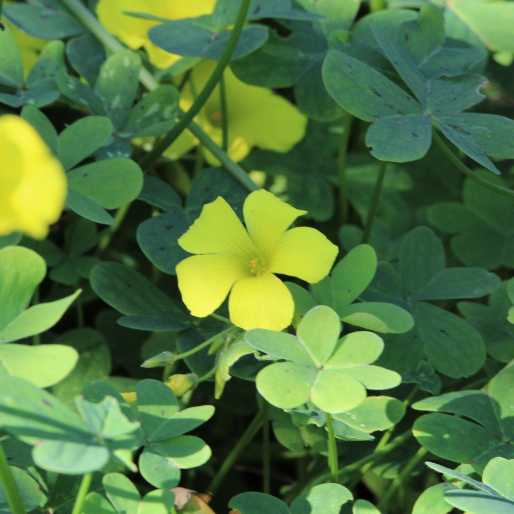 Una altra adventícia de flors grogues abundantíssima a les voreres és la vinagrella (Oxalis pes-caprae), en aquest cas realment una planta invasora, provinent de Sudàfrica, i que des de fa tres segles suposa una veritable plaga, ja que no hi ha cap animal que la se mengi. De fet, jo mateix record que, quan érem al·lots, ens agradava xuclar la tija d’aquesta herba de la família de les oxalidàcies, que té un gust ben àcid.