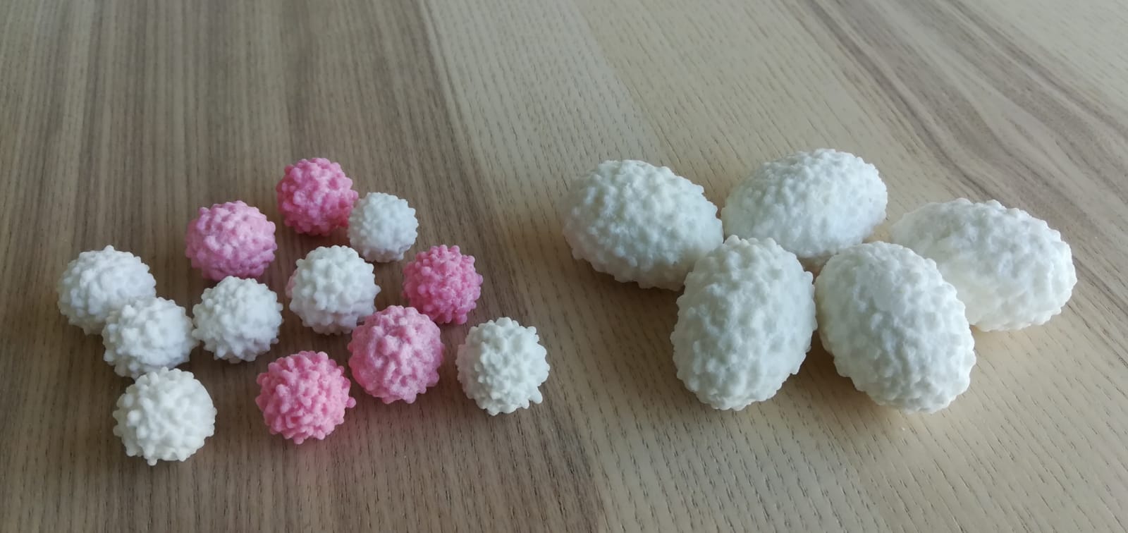 (punt de cocció d’un xarop a 115ºC, en el qual el xarop forma bombolles quan es bufa per a fer-lo passar a través dels forats d’una giradora), i llavors d’anís pels confits petits i un bessó d’ametla torrat pels grossos.
