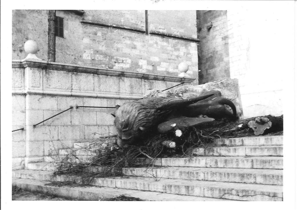 Vint-i-cinc anys més tard de la seva erecció, el març de 1970, una forta ventada tomà el gran pebreboner que hi havia davant la rectoria i aquest, a la vegada, tomà el lleó alat. Aquest va patir danys a una ala i a la coa, i a la base del monument i a l’escalonada encara avui són visibles els danys. Les dues instantànies d’en Tolo Ribas i Rotger Putxet (Sineu, 1937-2020) ens mostren com es varen trobar els sineuers el monument el 21 de març de 1970.
