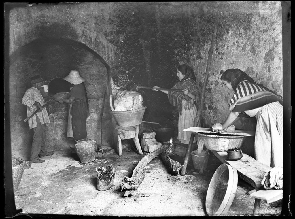 I una altra del porxo de la bugada on hi trobam les germanes Magdalena i Joanaina Munar i Jaume de sa Torre de Montornès (Sineu, 1902-1987), en Perico Munar i Jaume de Son Pere (Sineu, 1899-1980), na Catalina Conilla i un missatge no identificat, realitzant les tasques pròpies de la neteja de la roba.