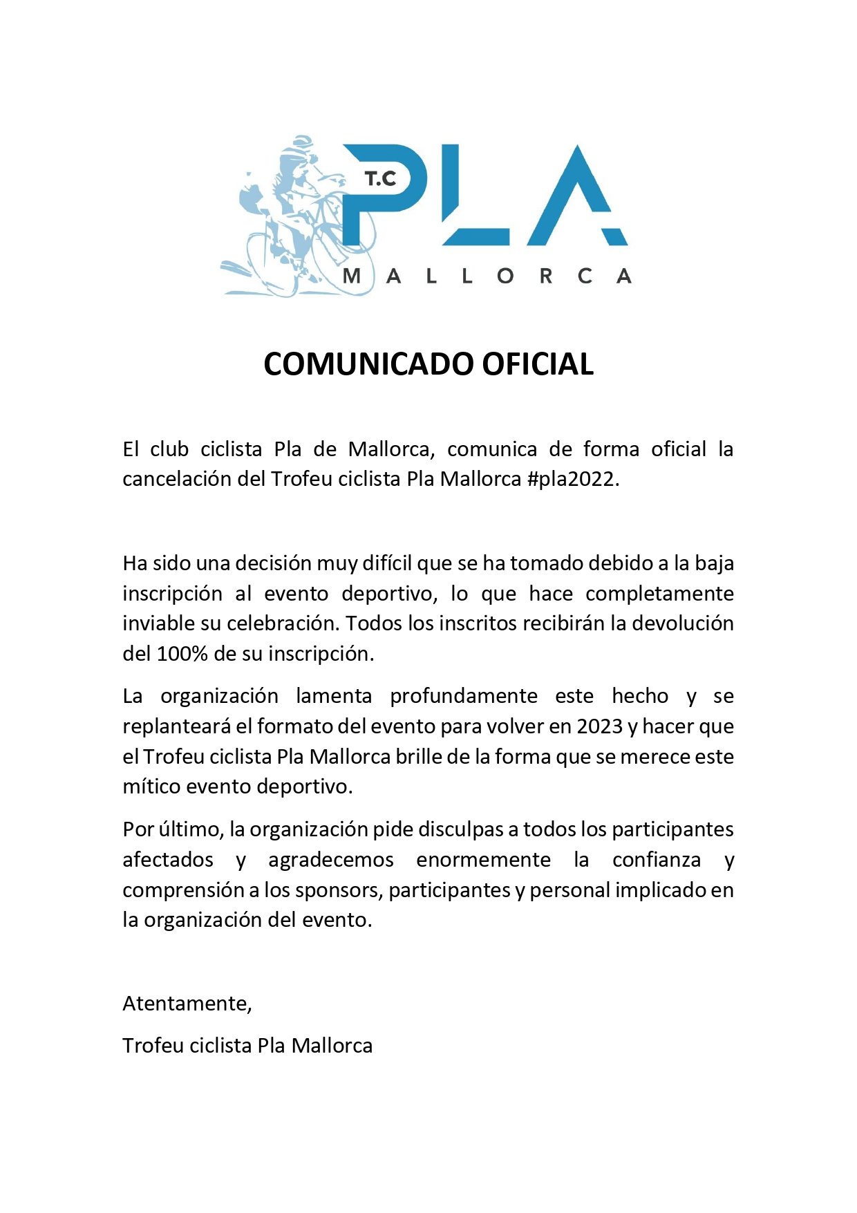 Fa unes hores, l’organització del Trofeu ciclista Pla de Mallorca ha fet públic un comunicat oficial on anul·la el Trofeu per manca d’inscripcions.