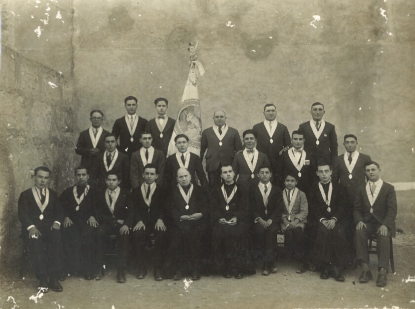 Fotografia de la Junta de la Congregació (1928) amb el penó (cedida per Malén Alomar i Vanrell)