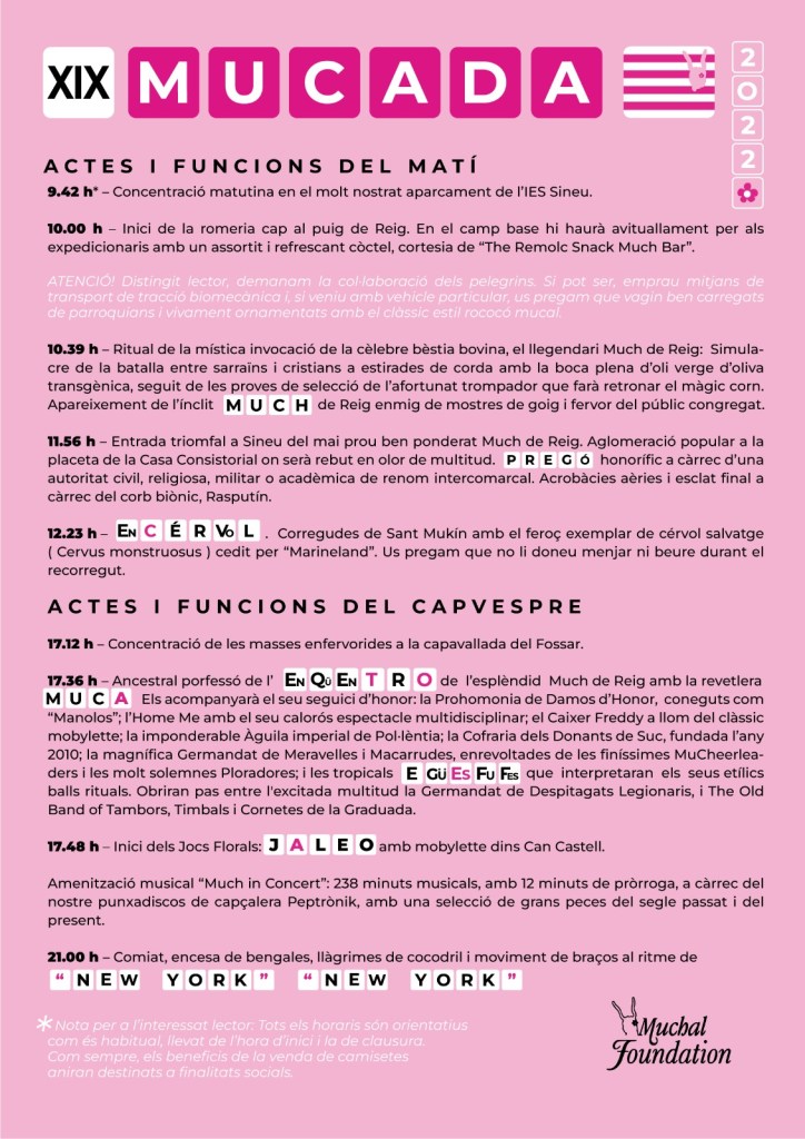 Seguint amb el leitmotiv de la camiseta d’enguany l’horari que trobareu a la imatge, també disseny de Rosa Mascaró Rous, està inspirat en un altre joc amb paraules digital, el Wordle. Serà una Mucada tan macarruda com sempre i més lletruda que mai.