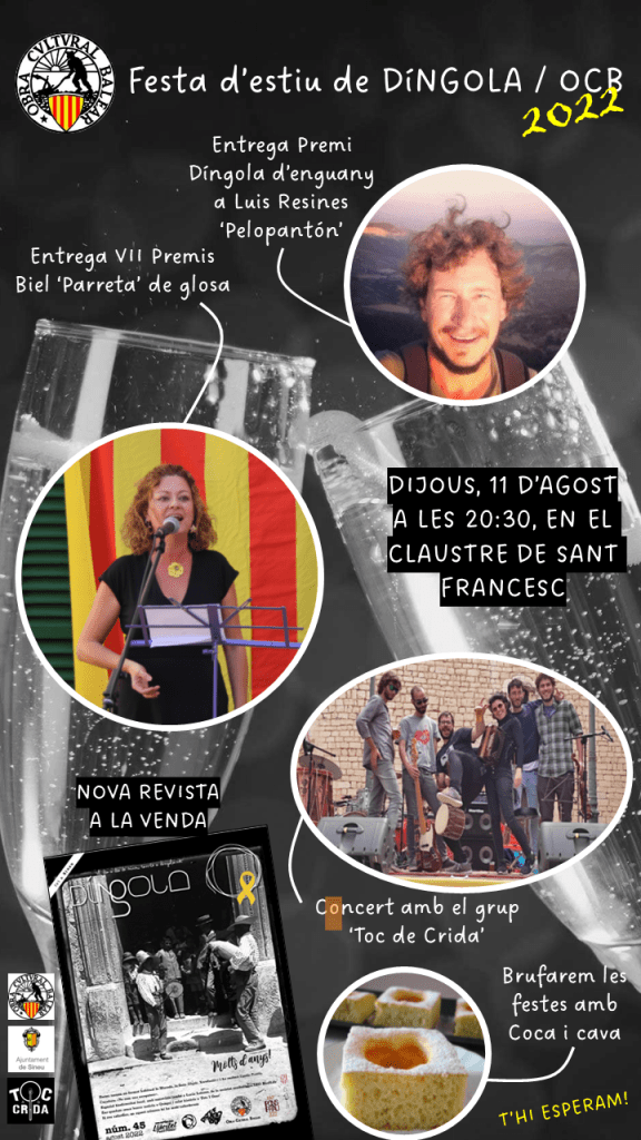 DIJOUS 11, A LES 20:30H, T’ESPERAM A LA FESTA D’ESTIU DE L’OCB SINEU, EN LA QUE S’ENTREGARAN ELS PREMIS DÍNGOLA I BIEL ‘PARRETA’.