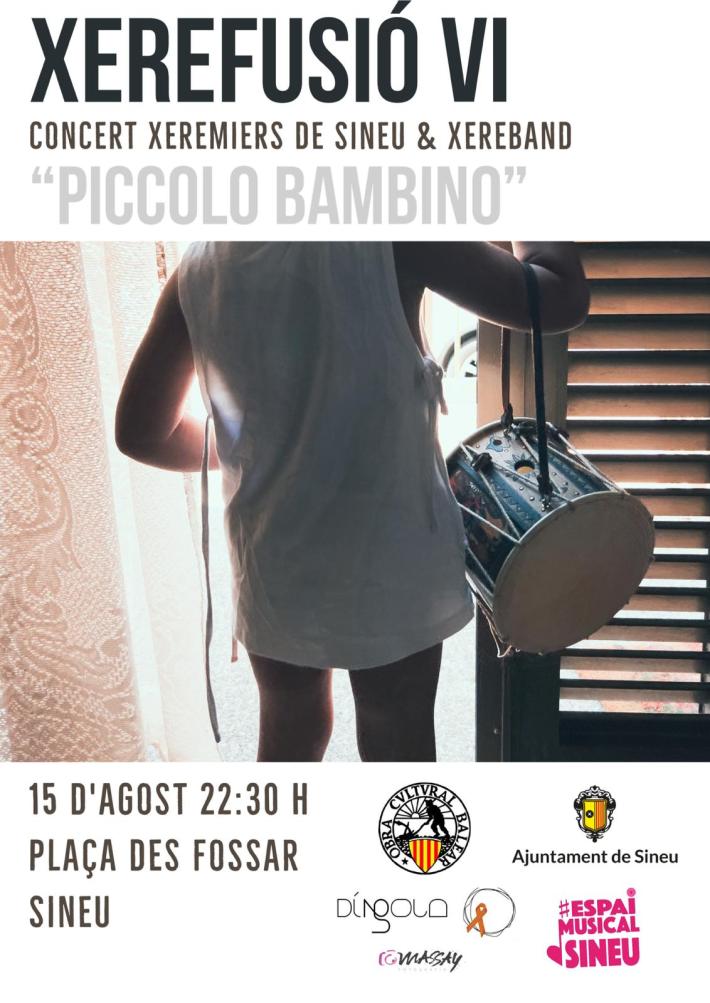 Podríem definir Xerefusió com la fusió, la mescla, del so i temes de la música tradicional amb l’ús d’instruments moderns. És un experiment que prepararen els Xeremiers de Sineu ja fa uns anys, i que ha perdurat. Aquest en concret serà el 6è Xerefusió, que combinarà els xeremiers i Xereband en l’espectacle ‘Piccolo Bambino’. Serà el día de la Mare de Déu d’Agost a les 22:30h a la Plaça des Fossar.