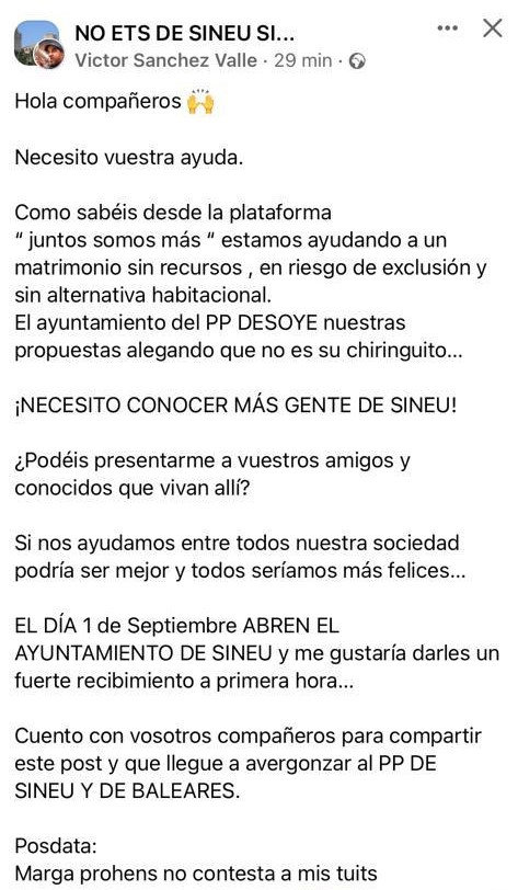 Un post d’un tal Víctor Sánchez Valle a un grup de Facebook sobre coses sineueres va cridar l’atenció fa uns dies, i va córrer per xarxes socials i grups de WhatsApp. Des d’una plataforma, Juntos somos más, cerca conèixer gent de Sineu i diu que volen donar un ‘fuerte recibimiento’ als de l’Ajuntament de Sineu, i carrega contra Marga Prohens –la líder del PP autonòmic– perquè no contesta els seus tweets. Sánchez assegura que una família resident a Sineu serà desnonada i que el batle de Sineu els va dir que «en això ell no podia fer-hi res». De fet, Sánchez va cercar treure el cas a la llum, i així surt en una noticia a l’Ultima Hora de la secció Click (fes clic aquí).