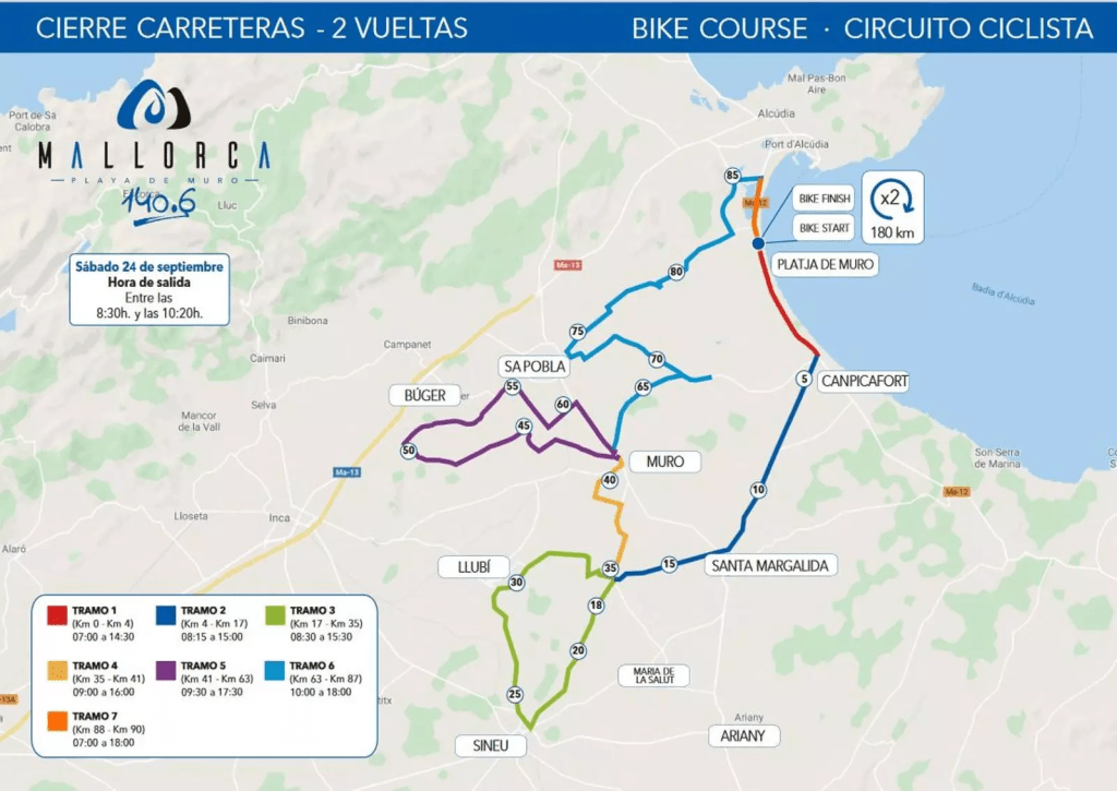 Muro i Alcúdia seran la seu, dissabte, de la segona edició del triatló internacional de mitja i llarga distància Mallorca 140.6. L’activitat esportiva suposarà restriccions de trànsit a algunes vies i carreteres. En concret, a Sineu afectarà durant la franja horària de les 8,30 h a les 15,30 h a les carreteres de Sineu-Muro i Sineu-Llubí, amb el tram de la carretera Manacor-Inca que enllaça ambdues carreteres.