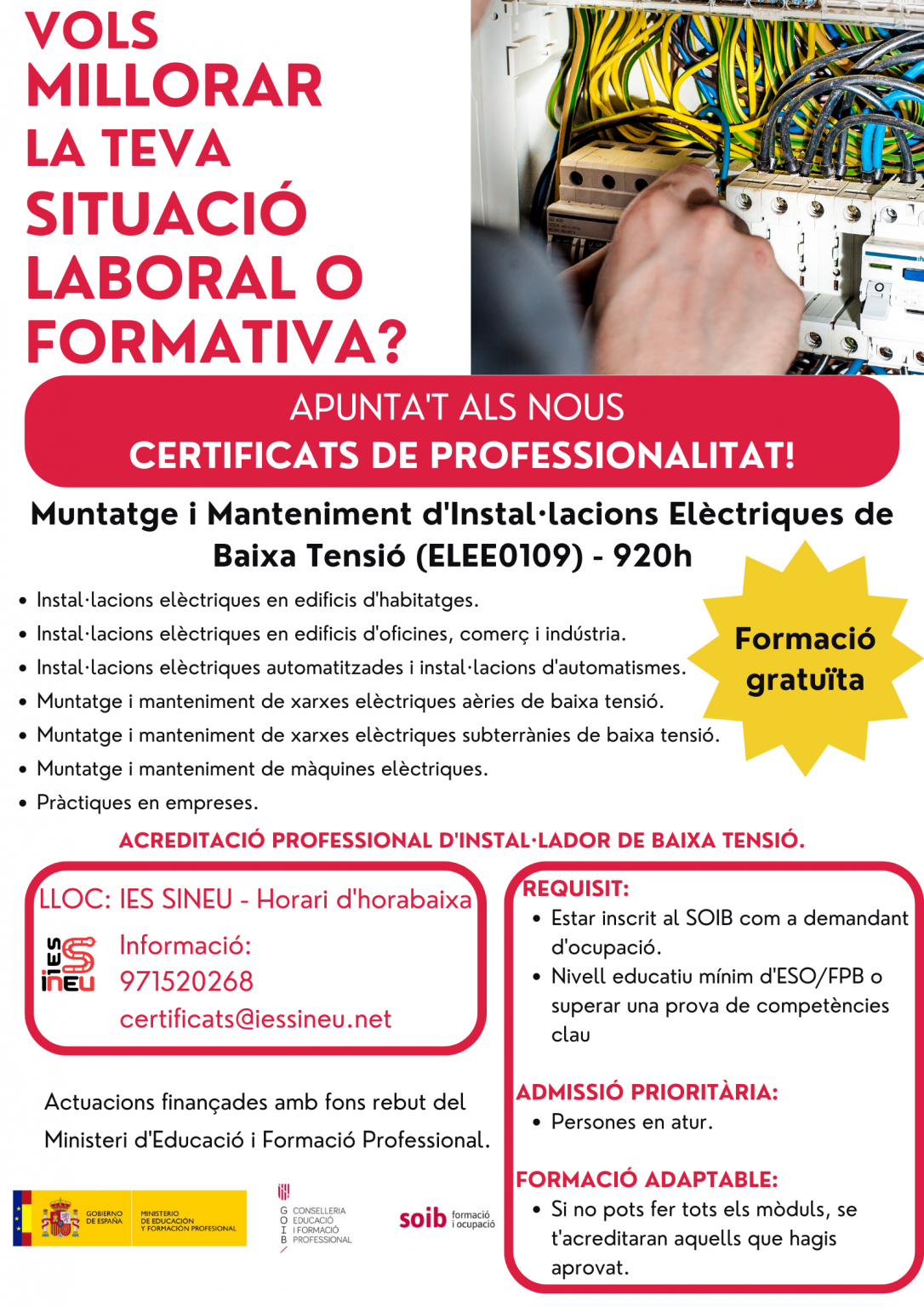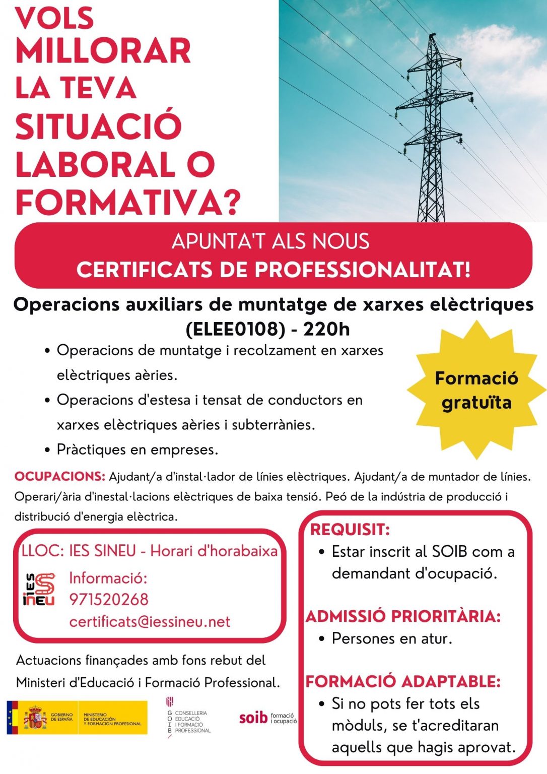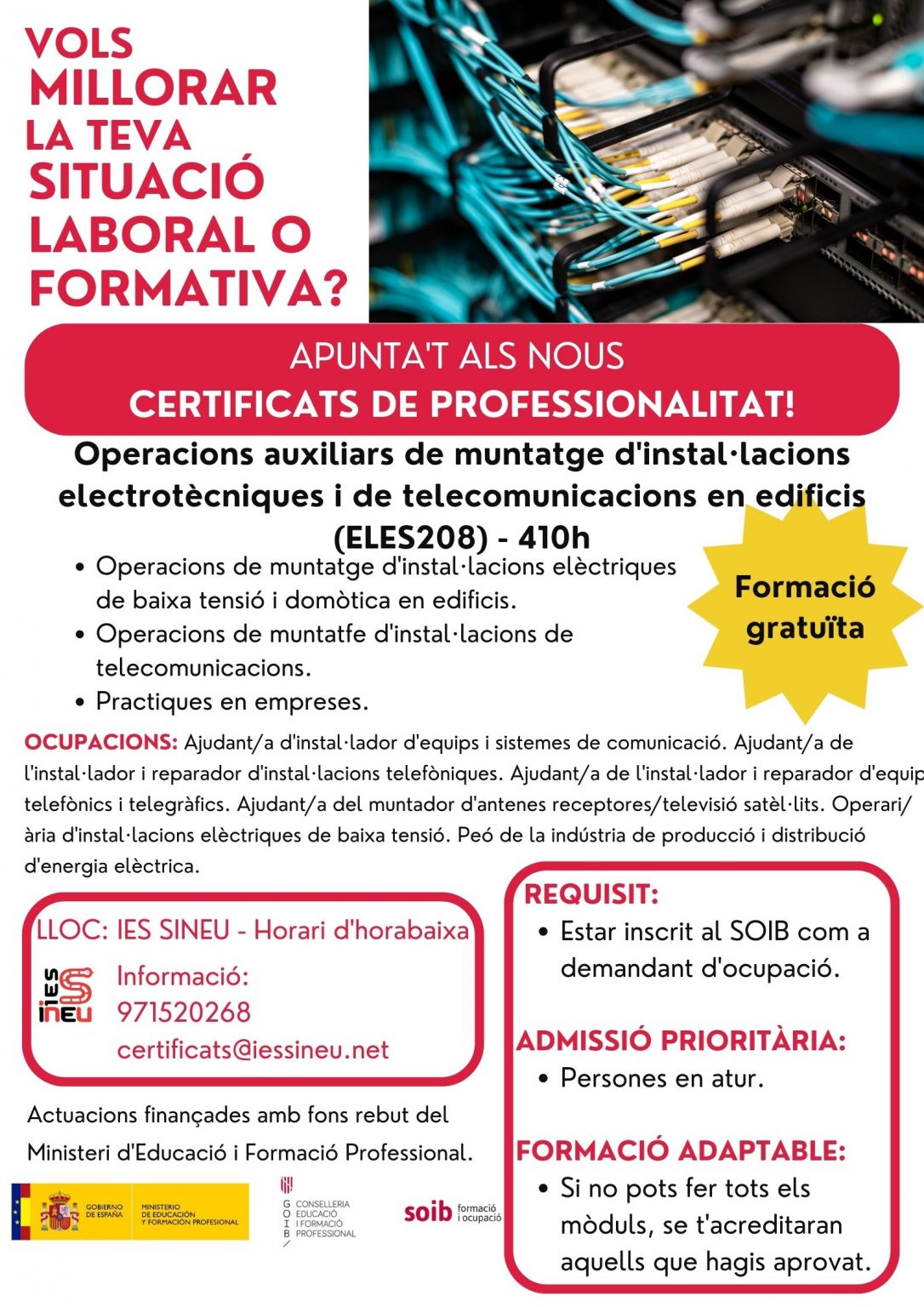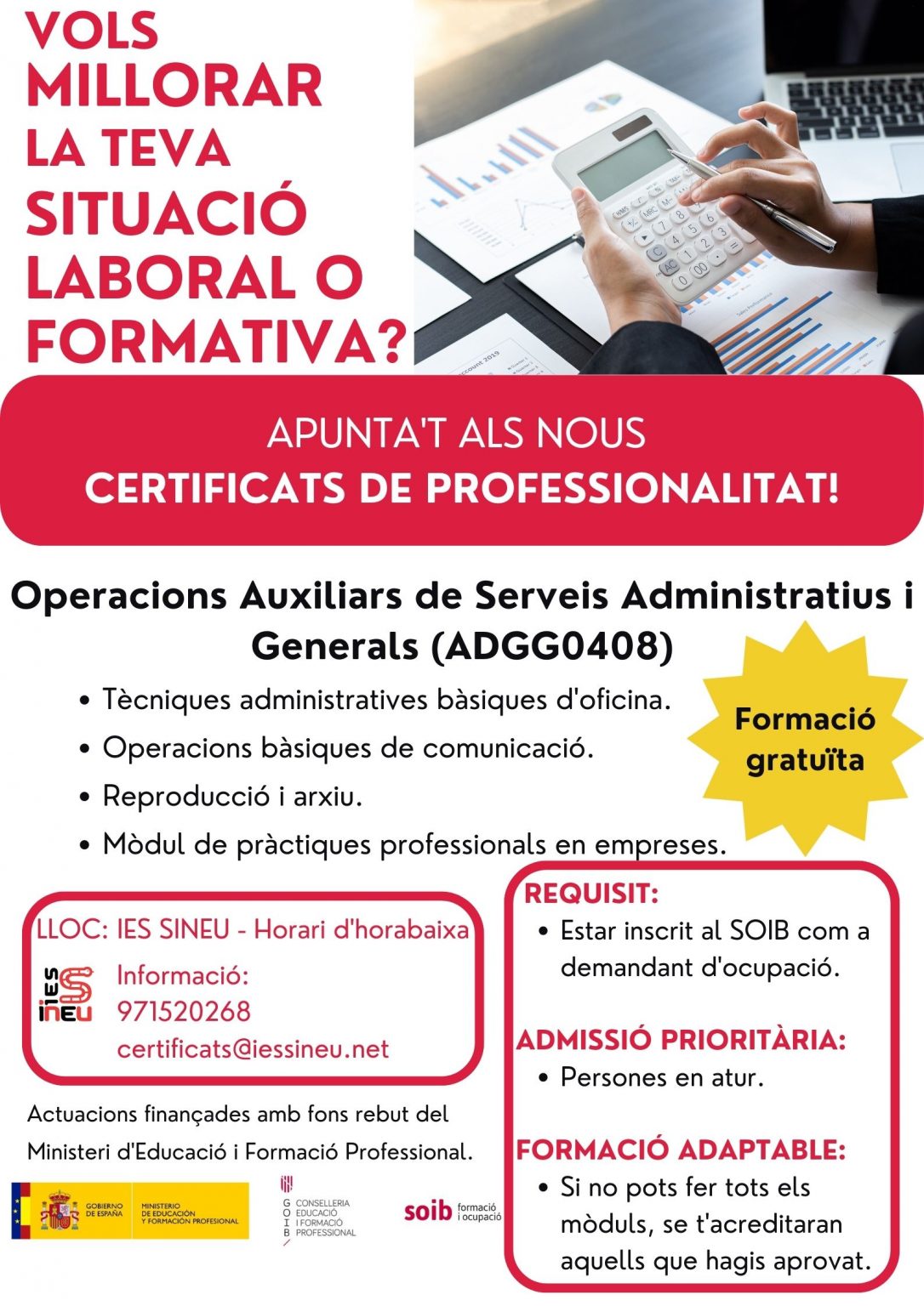 L’IES Sineu ha posat en marxa el procediment per a l’obtenció de quatre certificats de pofessionalitat que són formacions totalment gratuïtes i proporcionen acreditacions oficials de: