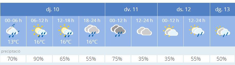 Els propers dies hi podria haver algun ruixat, però en principi sembla que no hi ha gran perill pel Contrallum de dissabte, però sí un poc. En concret, segons l’AEMET, hi ha un 55% de probabilitat de pluja entre les 12h del migdia i les 12h de la nit.