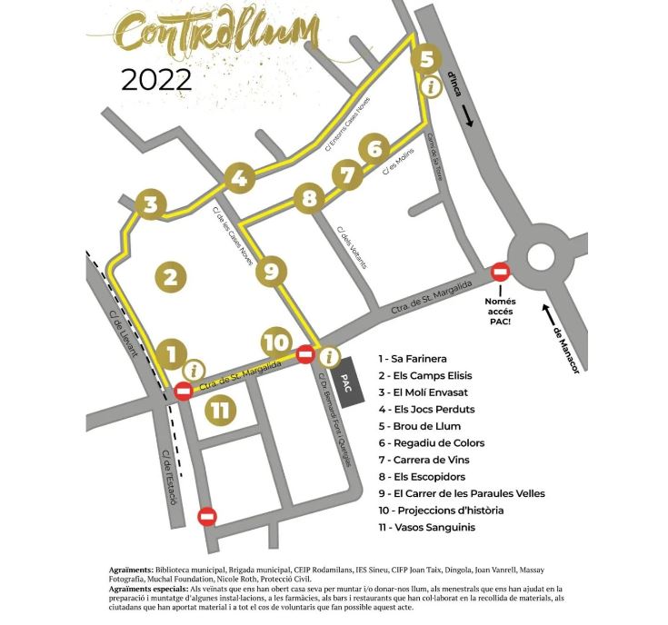 L’organització (Col·lectiu Contrallum) ja ho té tot preparat. I òbviament, l’Ajuntament. Es tancarà la carretera de Maria i Santa Margalida, entre el vial de circumval·lació i el Molí den Pau. Tres dotzenes de voluntaris i organitzadors vetllaran pel bon desenvolupament de l’esdeveniment, a part de Policia Local i Protecció Civil. Hi haurà tres punts d’informació durant el recorregut, que enguany serà en un sol sentit (perquè hi ha llocs, com a devora sa Farinera, on només pot passar una persona). L’itinerari es podrà recórrer entre les 19 i les 22h.