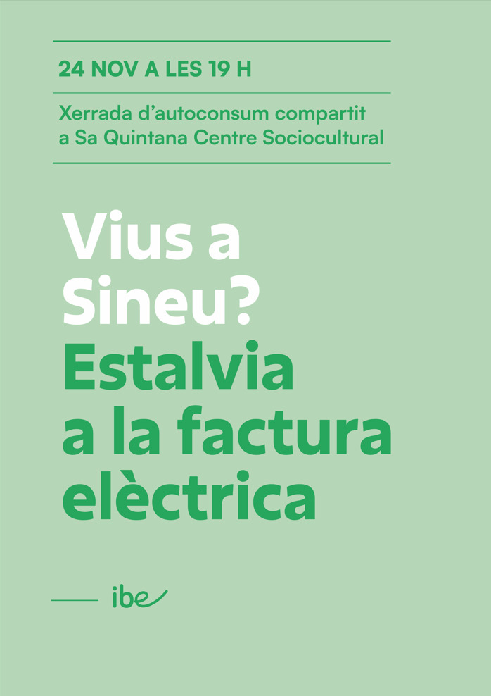 Dijous dia 24 de novembre a les 19 h, a Sa Quintana, l’Institut Balear d’Energia oferirà una xerrada sobre l’autoconsum compartit, una forma d’aprofitar l’energia solar mitjançant plaques fotovoltàiques per part de diversos usuaris que s’associen pel benefici que aporta l’ús d’energies renovables a partir d’una instal·lació compartida.