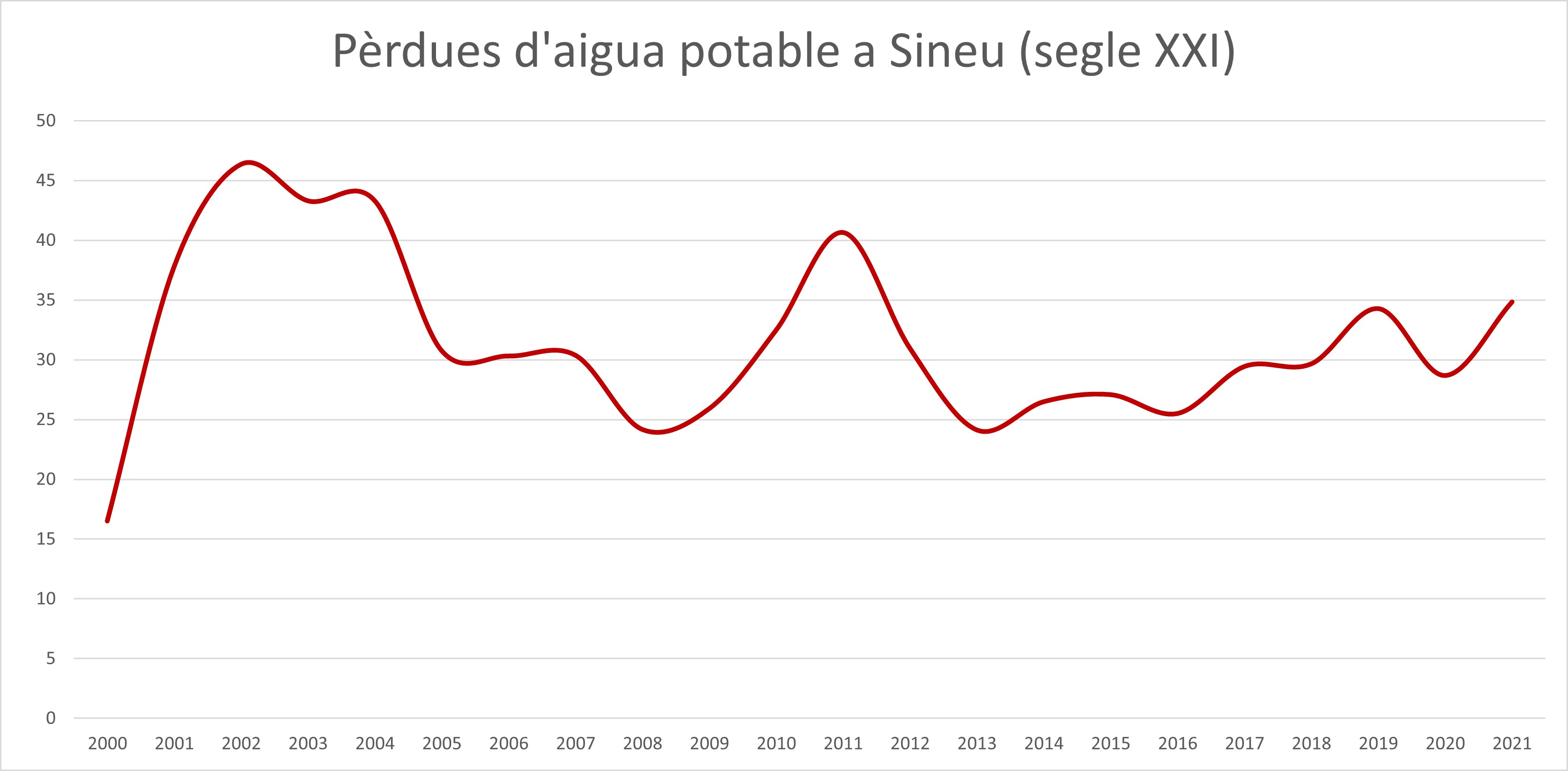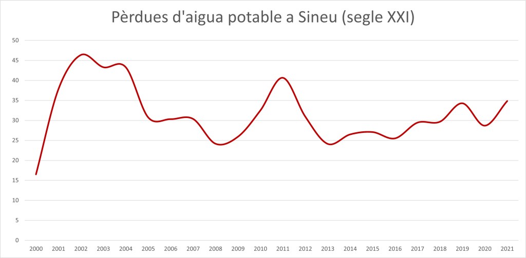 Ja fa temps que els especialistes en medi ambient alerten del mal estat de les xarxes d’aigua. De fet, DíNGOLA ja informava de les pèrdues d’aigua l’any 2016 (fes clic aquí), amb un 40’5% de dèficit entre aigua subministrada i aigua consumida. En el gràfic podeu veure el que representen les pèrdues d’aigua des d’inicis d’aquest segle, fa 22 anys: