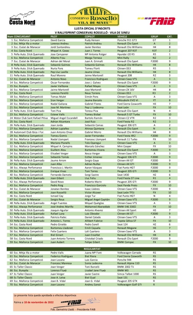 El V Rallysprint Conservas Rosselló -Vila de Sineu- tornarà ser el rally amb més participació de l’any, amb 59 cotxes més 10 cotxes que participaran a la regularitat. Tot a punt idò per aquest cap de setmana on els cotxes seran els protagonistes.