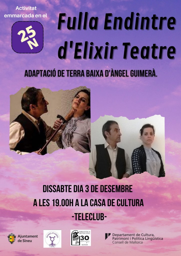 Demà dissabte a les 19 h al Teleclub representaran l’obra Fulla Endintre a càrrec d’Elixir Teatre, adaptació del clàssic Terra Baixa d’Àngel Guimerà. Acte organitzat per Dones d’Arrel i la Biblioteca de Sineu.