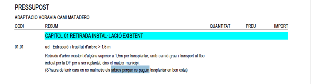 L’eixamplament de la voravia del vial sud requerirà la retirada dels 42 arbres, la majoria lledoners i morers, que hi ha actualment a les voreres i la plantació d’un altre tipus d’arbre menys voluminós i que no faci malbé el trespol. Segons el projecte, s’ha de tenir cura de no malmetre els arbres que llevin perquè puguin ser trasplantats en un altre lloc. Els nous arbres estaran més a prop del vial per a permetre eixamplar la voravia.