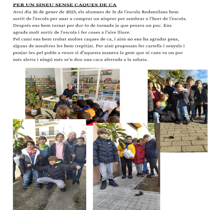 Ahir, els alumnes de 3r de l’escola Rodamilans varen sortir de l’escola per anar a comprar un nisprer per sembrar a l’hort de l’escola i pel camí es varen trobar moltes caques de ca. Ens han enviat un escrit amb fotografies que reproduim a continuació. El fet és que no volen quedar mans plegades davant el fet i el que feren va ser posar-se en contacte amb l’Ajuntament i faran una campanya conjunta de conscienciació dirigida a les famílies amb cans (repartiran bossetes per recollir les caques i cartelleria).
