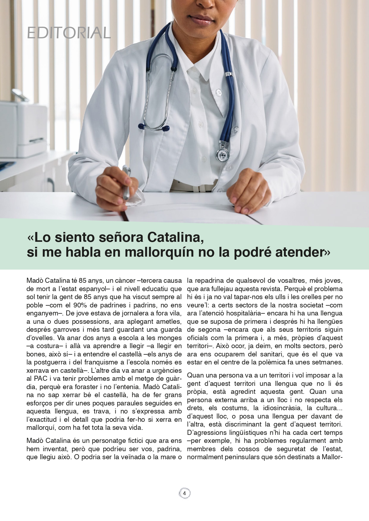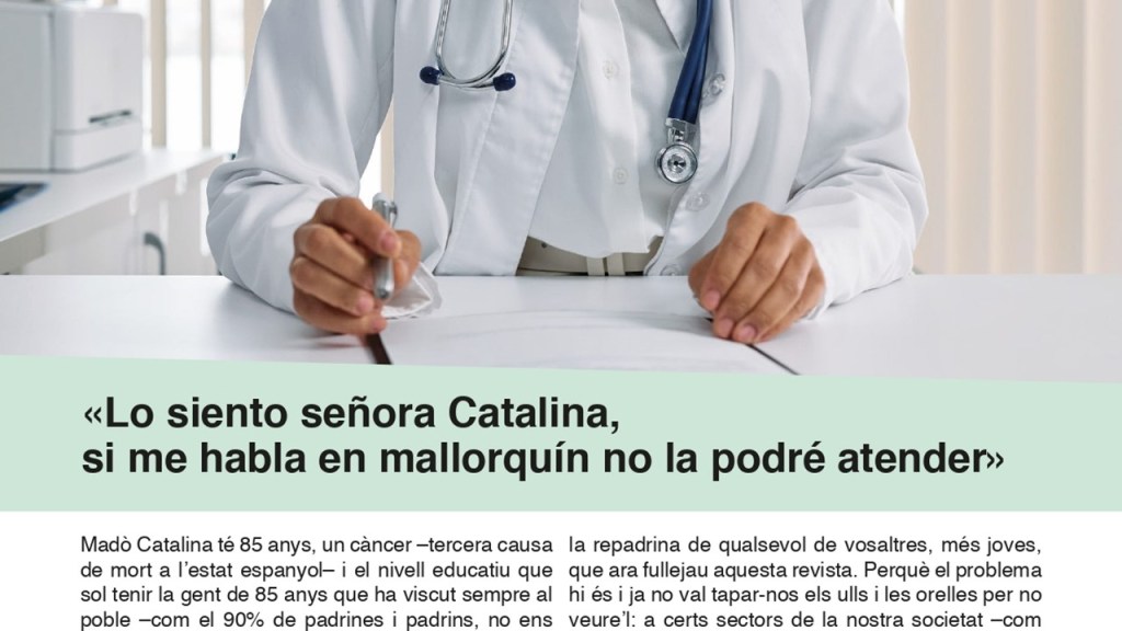 Madò Catalina és un personatge fictici que ara ens hem inventat, però que podríeu ser vos, padrina, que llegiu això. O podria ser la veïnada o la mare o la repadrina de qualsevol de vosaltres, més joves, que ara fullejau aquesta revista. Perquè el problema hi és i ja no val tapar-nos els ulls i les orelles per no veure’l: a certs sectors de la nostra societat –com ara l’atenció hospitalària– encara hi ha una llengua que se suposa de primera i després hi ha llengües de segona –encara que als seus territoris siguin oficials com la primera i, a més, pròpies d’aquest territori–. Això ocor, ja deim, en molts sectors, però ara ens ocuparem del sanitari, que és el que va estar en el centre de la polèmica fa unes setmanes.