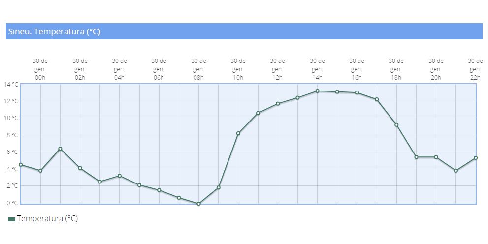 A la fi va arribar el fred, fa una setmana i mitja, i en aquests moments tenim les muntanyes de la Serra de Tramuntana amb un gruix considerable de neu. Ahir, 30 de gener, les temperatures en l’estació meteorològica del Poliesportiu Son Magí foren de 0 ºC en algun moment de la matinada, com veieu en el gràfic. Les màximes foren de 13 ºC en les hores punta del dia (entre les 14h i les 15h). Les mínimes de 0 ºC continuaran alguns dies.