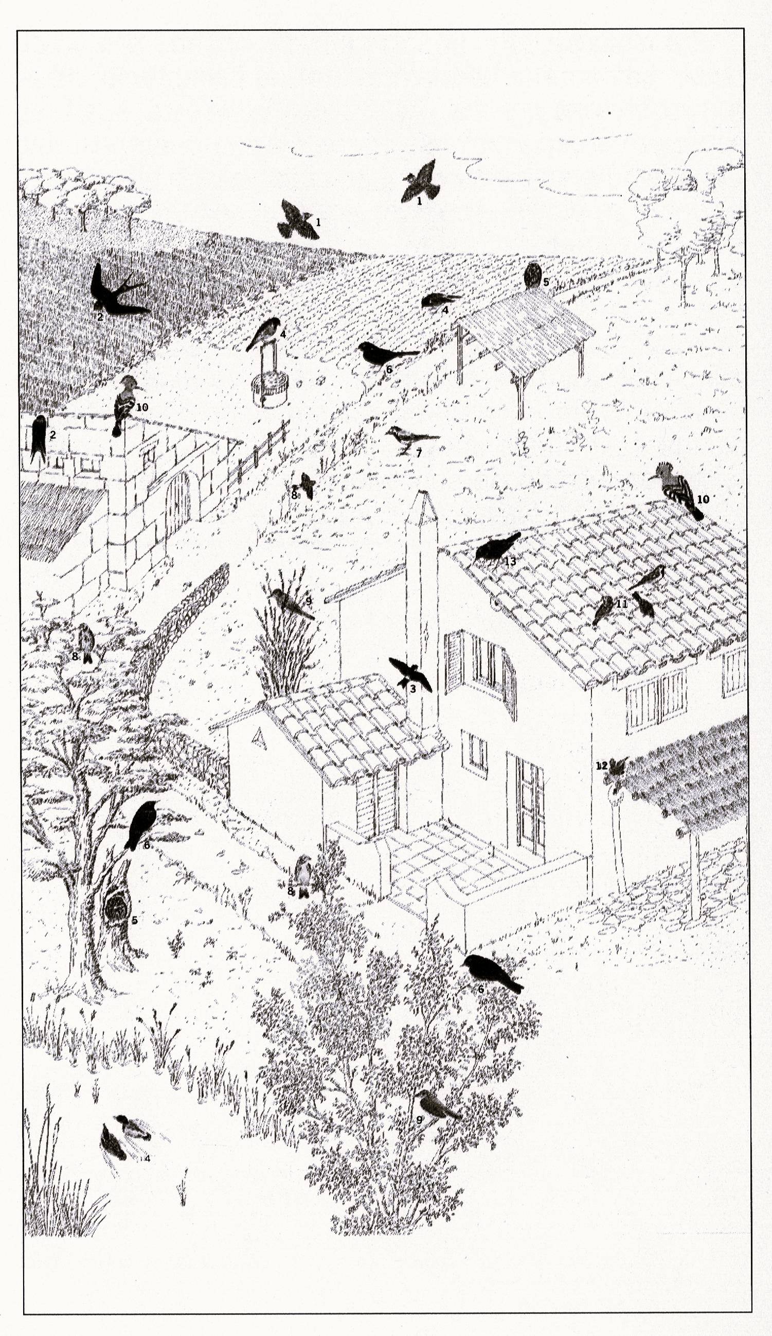 Diu Margalef: “l’ocupació de l’espai per les plantes és una de les bases de l’estructuració dels ecosistemes, …”. La imatge adjunta, en la que es pot observar l’alta diversitat d’ocells, em retreu a la combinació d’un lloc poc urbanitzat, per exemple el llindar del poble, amb arbres, i rodejat de camps de conreu. Les connexions aèries, corredors biològics o ecològics, afavoreixen la biodiversitat dels ecosistemes. Pensem en les interaccions entre ocells i insectes, tan importants per eliminar els que ataquen a les plantes. Biodiversitat és sinònim de maduresa per la complexitat de les xarxes que s’hi estableixen, una de les idees bàsiques de l’ecologia. La imatge està treta del llibre: L’ECOLOGIA. Ramon Margalef (1985). Diputació de Barcelona. Servei de Medi Ambient