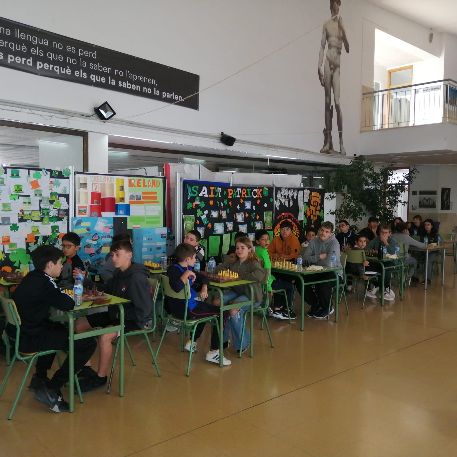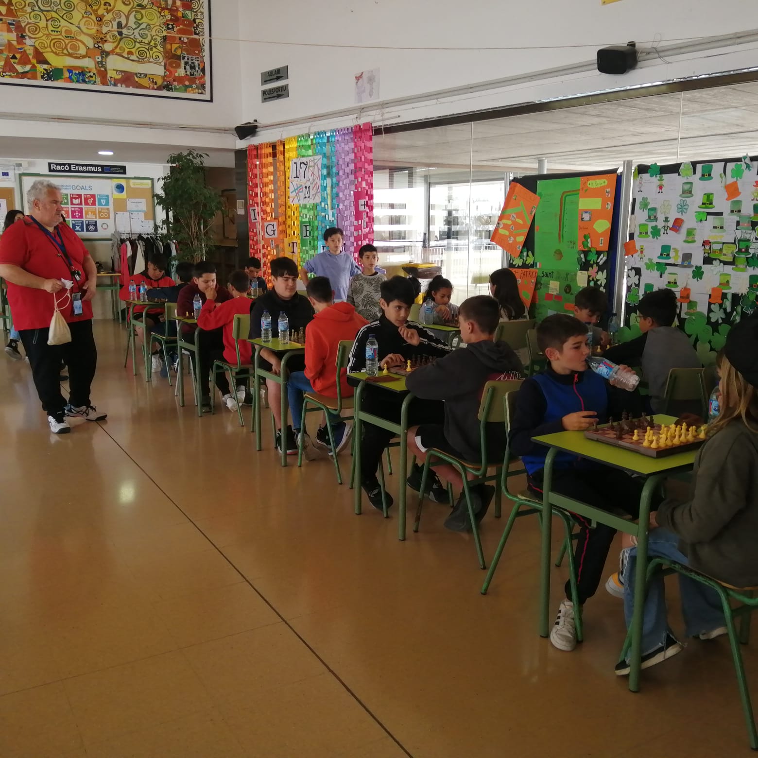 El hall de l’institut s’ha omplit de participants que han gaudit del joc d’escacs que, com diuen les promotores, és un recurs que potencia el desenvolupament de les estructures cognitives, el raonament i el pensament logicomatemàtic, les habilitats lingüístiques i els hàbits de conducta.